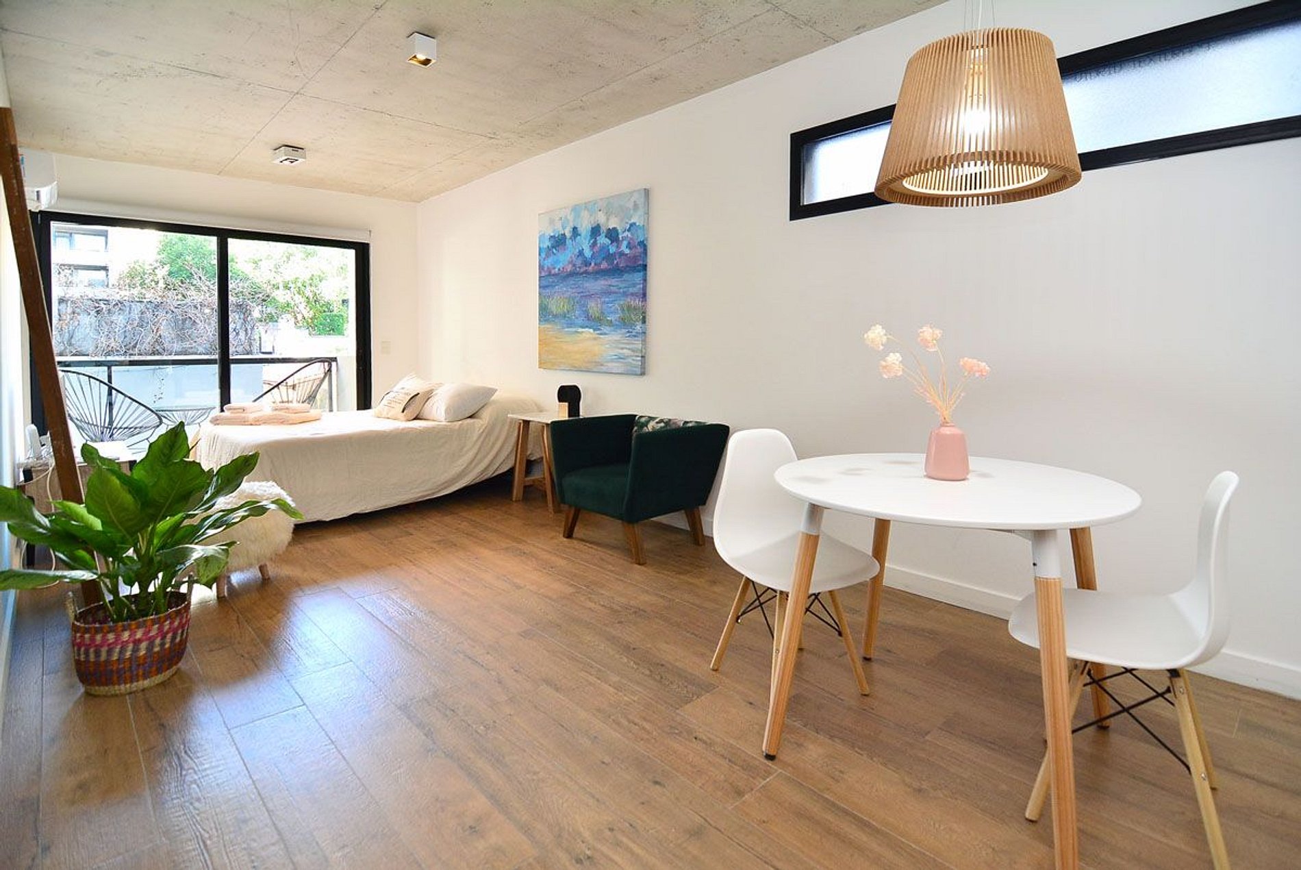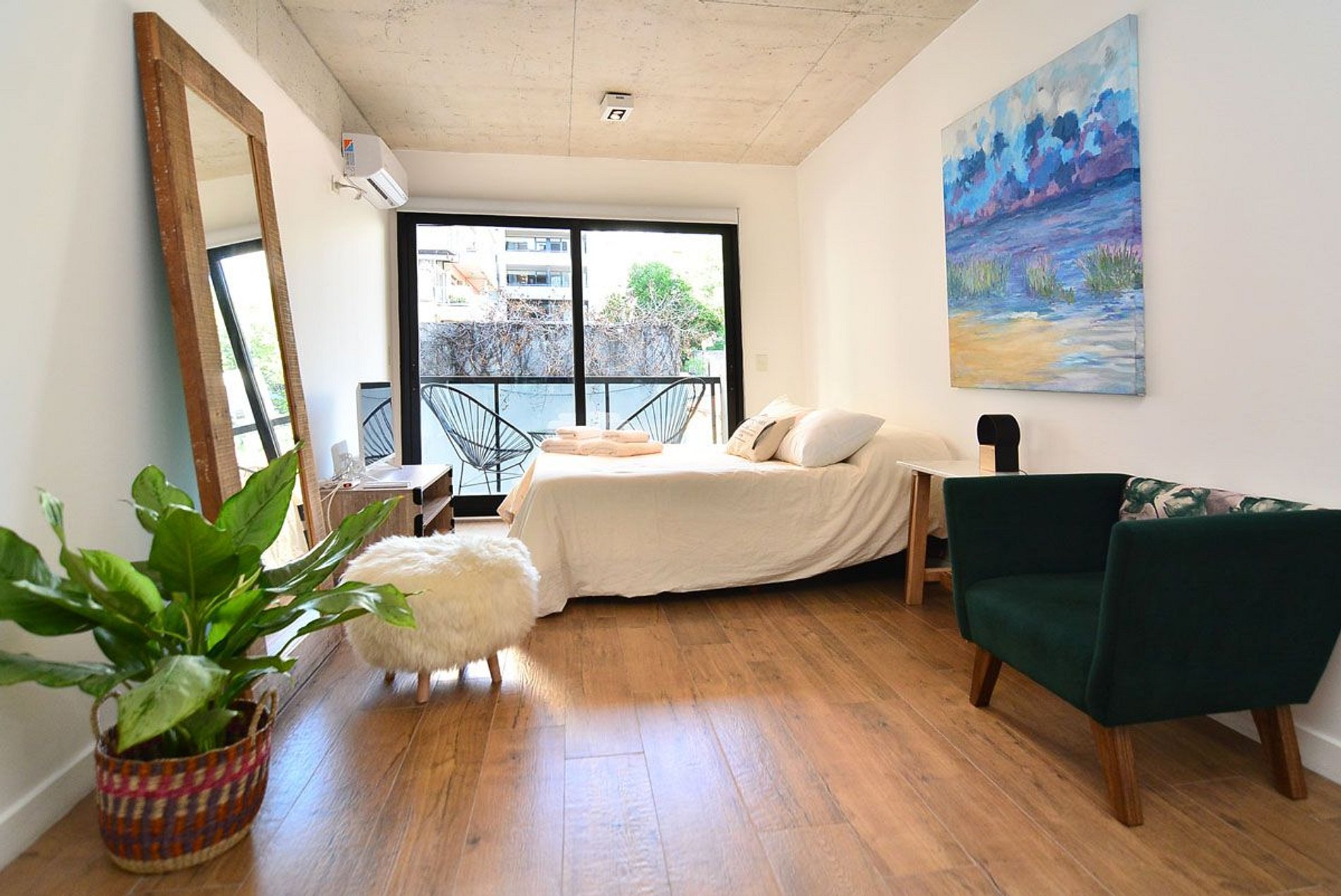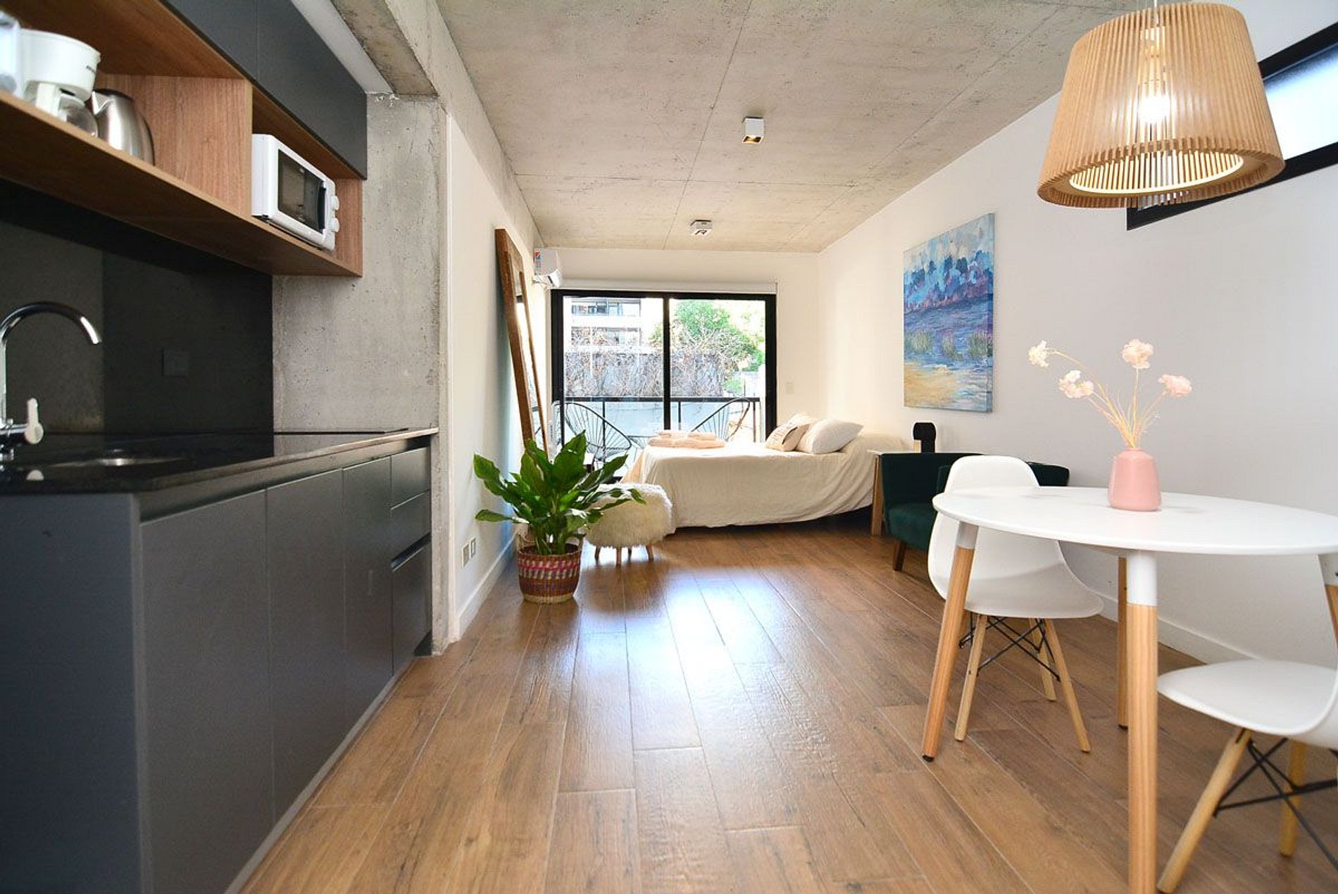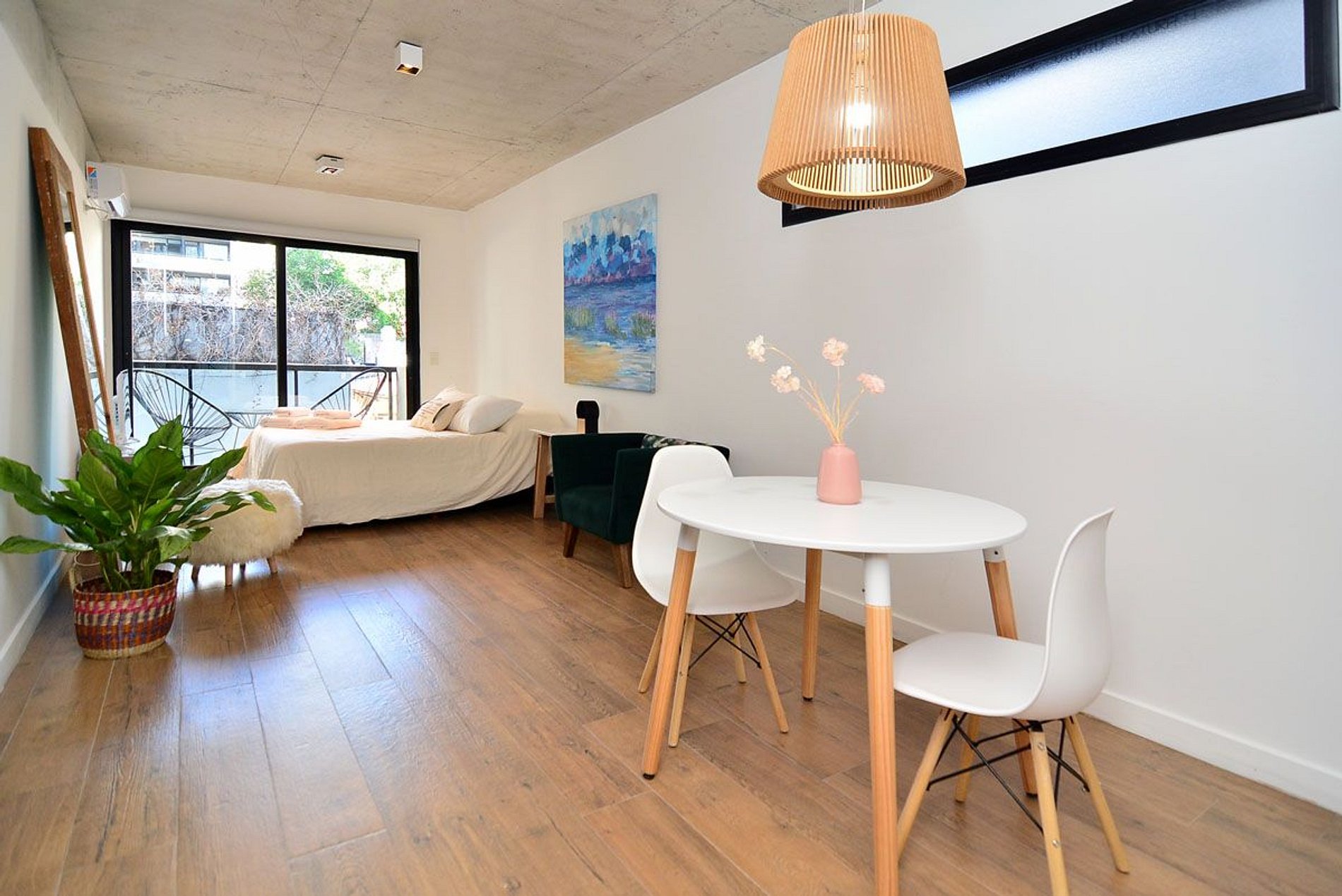 Beautiful, spacious, and comfortable studio apartment. Excellent location: close to everything and away from the noise. Very bright. Sleeps 2. Queen-size bed. Modern and functional decor. Wi-Fi, Smart TV, 2nd floor, balcony. Nearby shops. Very close to Santa Fé Avenue, transportation (Subway D, train, and buses), various food stores, delivery shops, bakeries, and cafes. Check-in from 3 p.m. Check-out by 10 a.m.