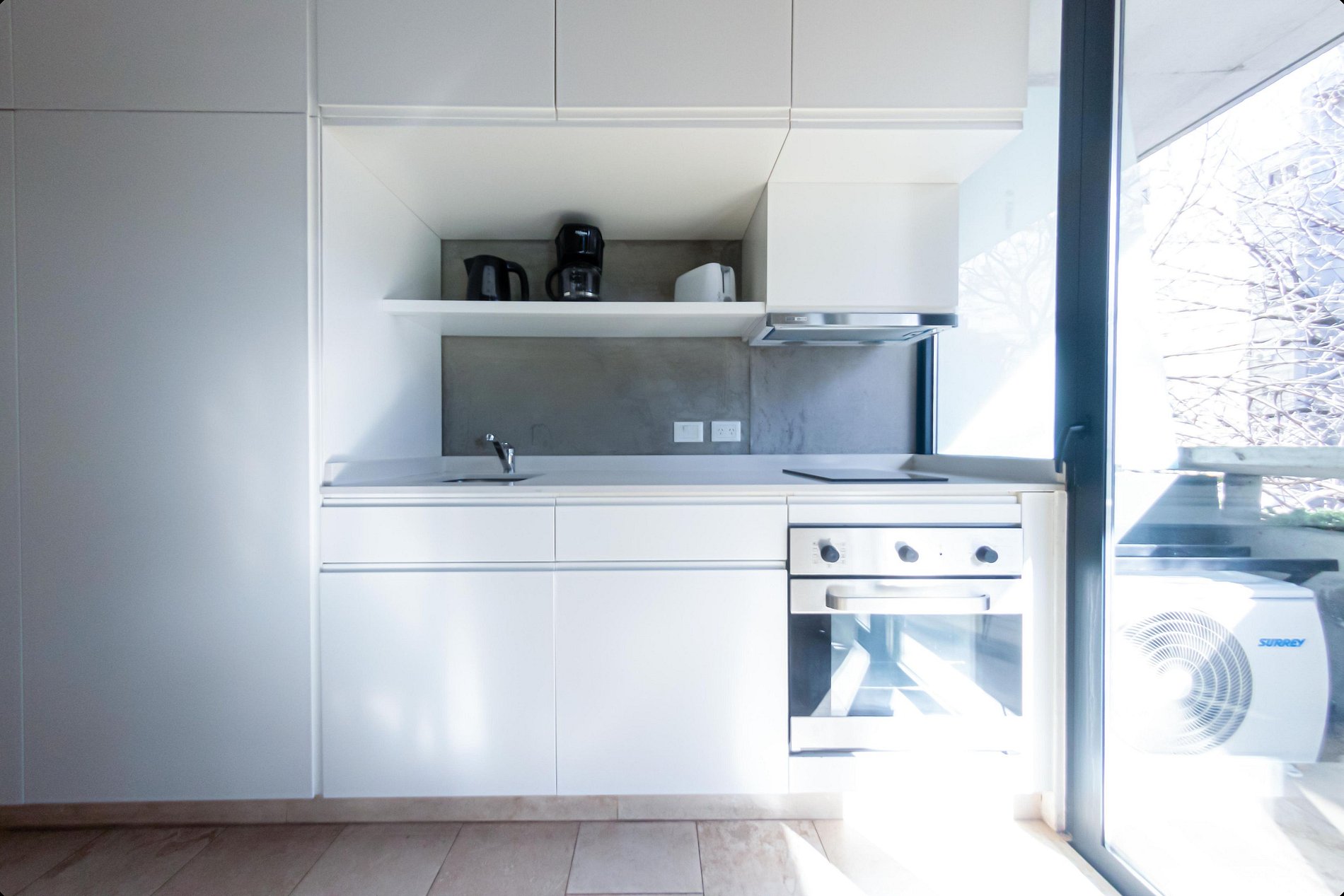 The space is open and bright thanks to its large windows that connect to a spacious balcony. It is a modern, spacious studio apartment with a functional and elegant design. It has a double bed, a dining area, an armchair, a Smart TV, and air conditioning. The kitchen is fully equipped and has plenty of storage space. The bathroom is spacious and comfortable, with a walk-in shower and a glass enclosure, offering a relaxing experience.