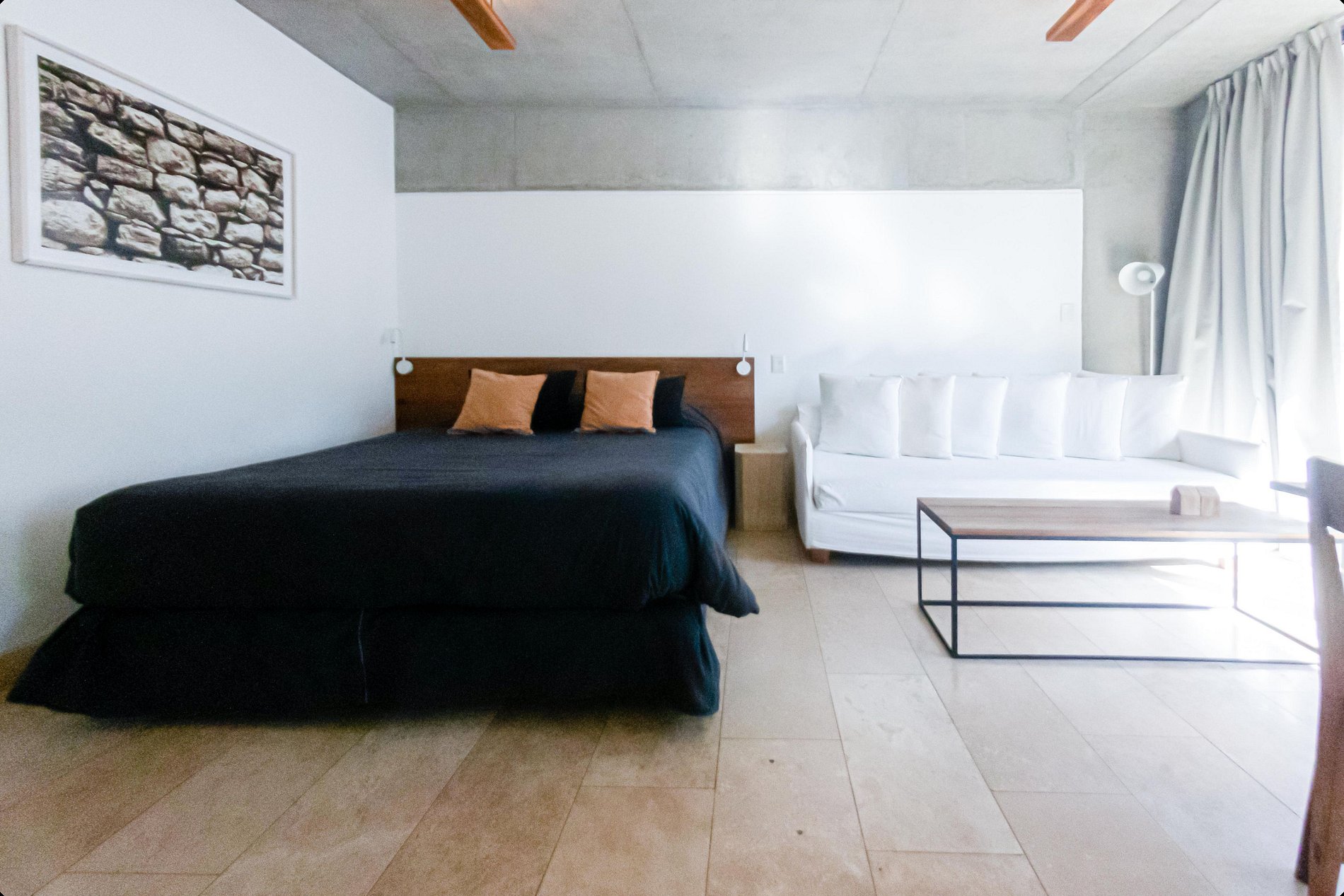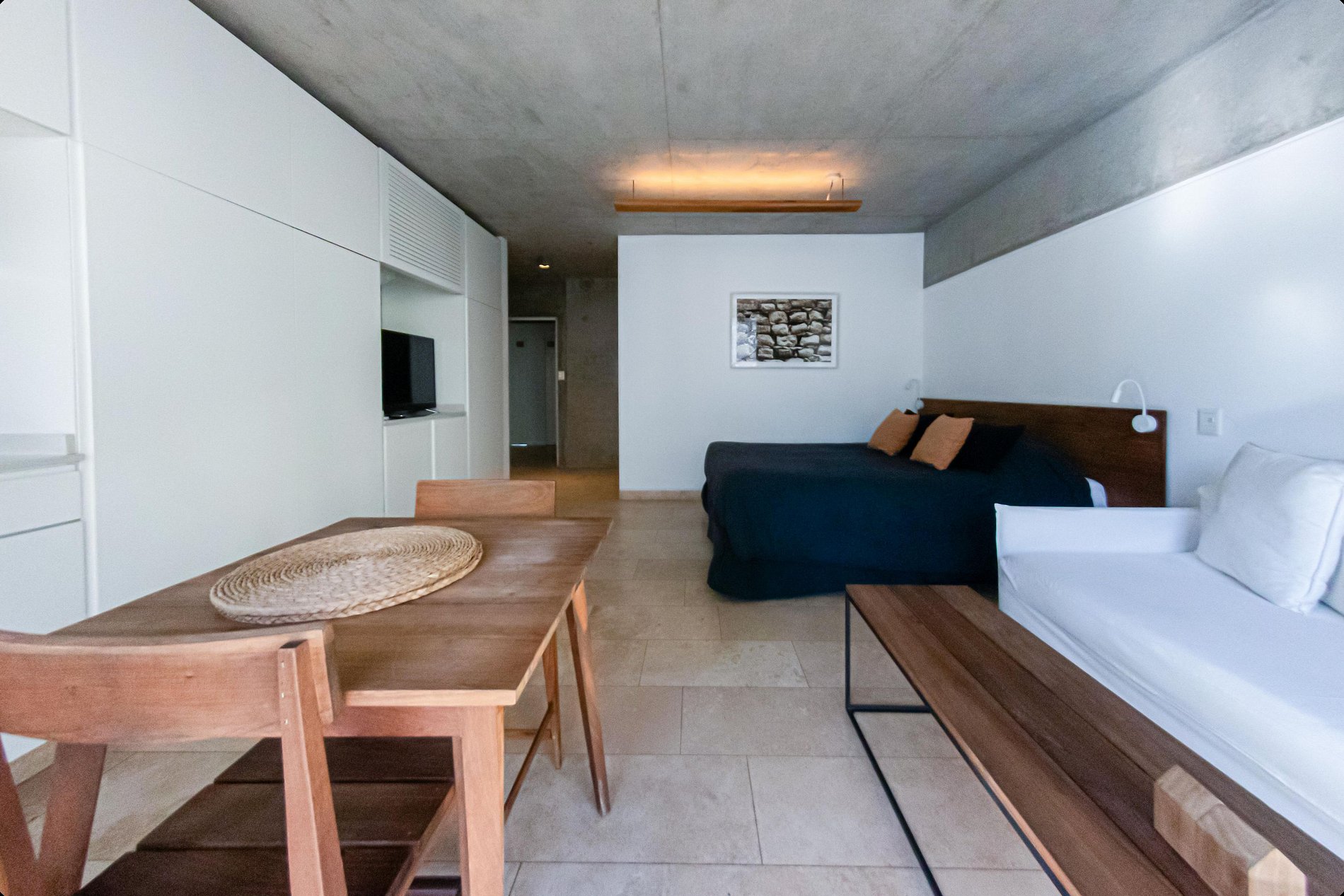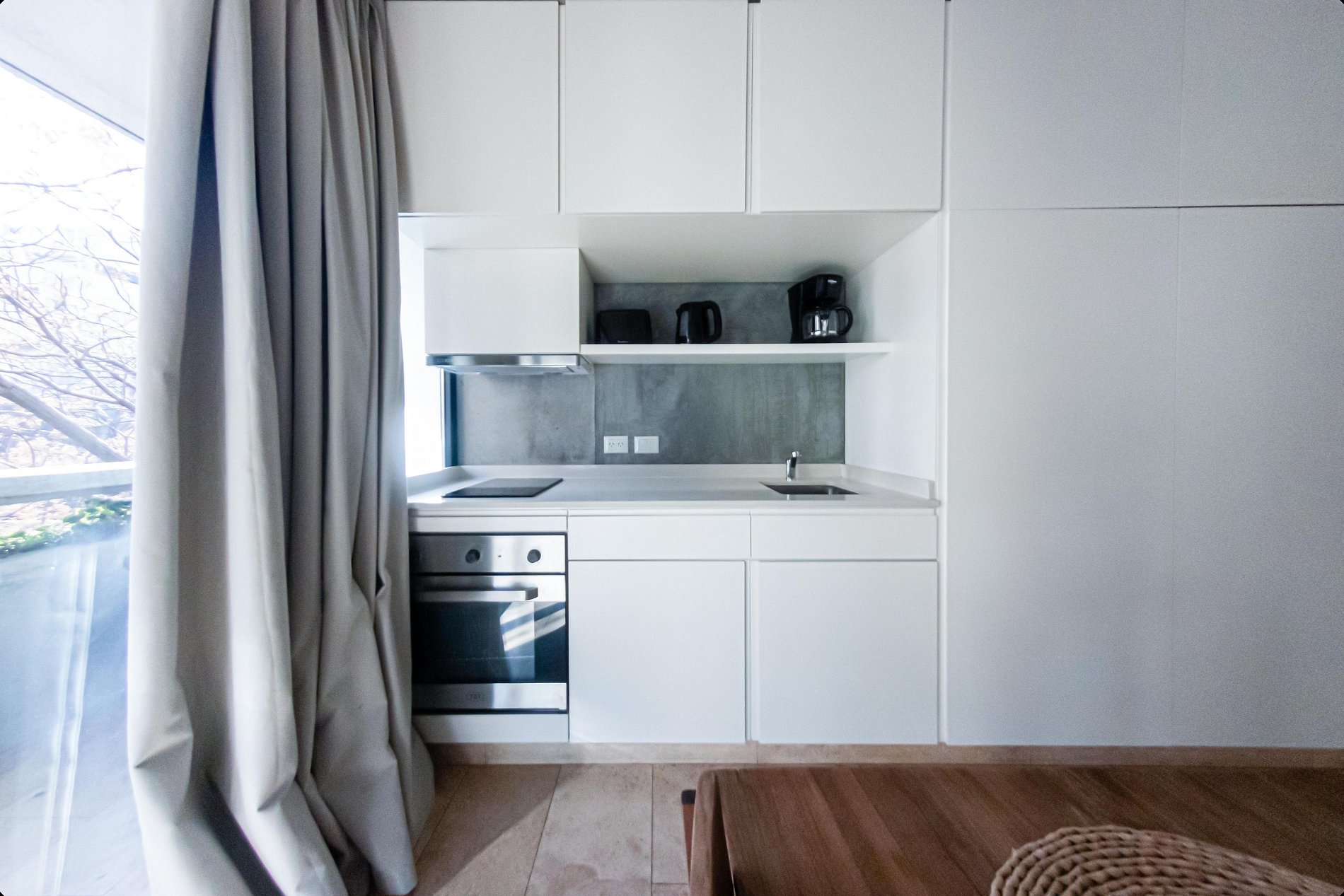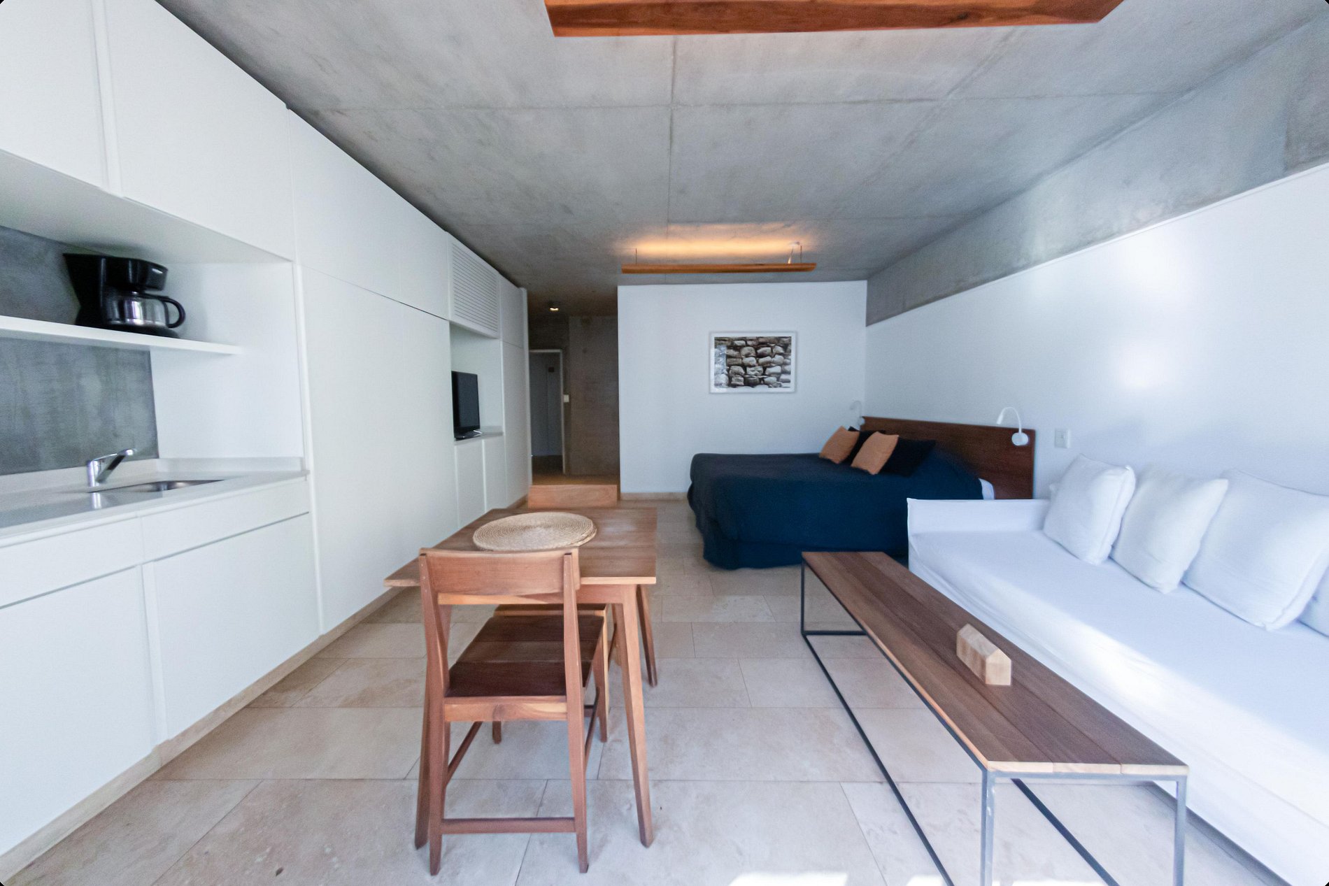 The space is open and bright thanks to its large windows that connect to a spacious balcony. It is a modern, spacious studio apartment with a functional and elegant design. It has a double bed, a dining area, an armchair, a Smart TV, and air conditioning. The kitchen is fully equipped and has plenty of storage space. The bathroom is spacious and comfortable, with a walk-in shower and a glass enclosure, offering a relaxing experience.