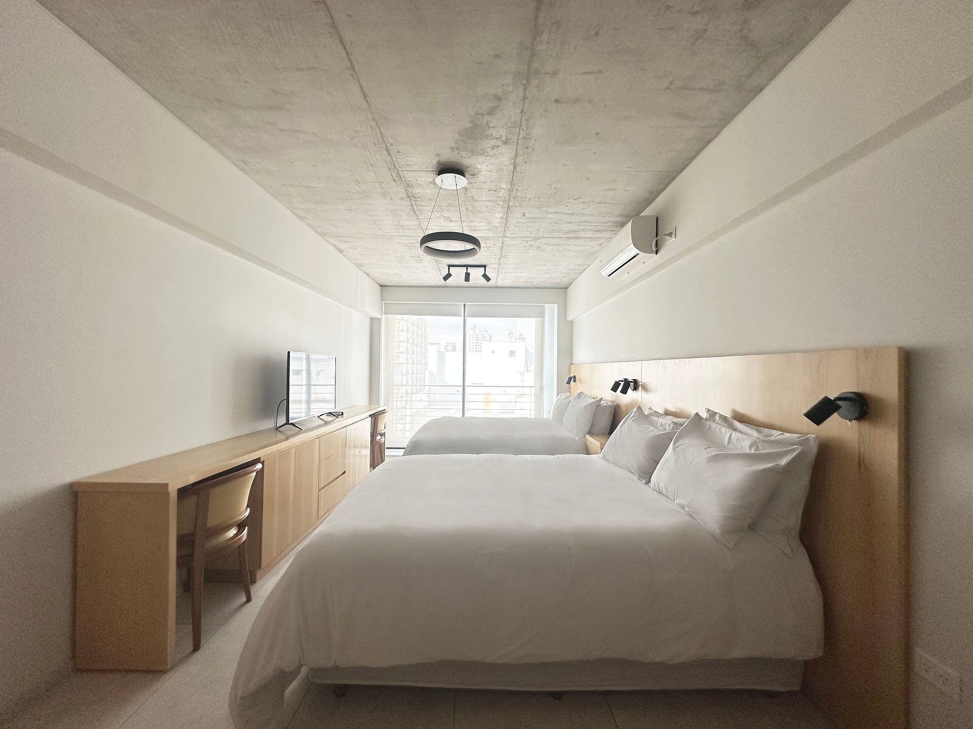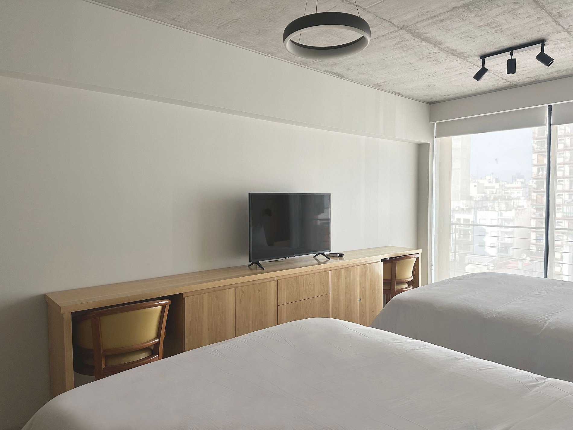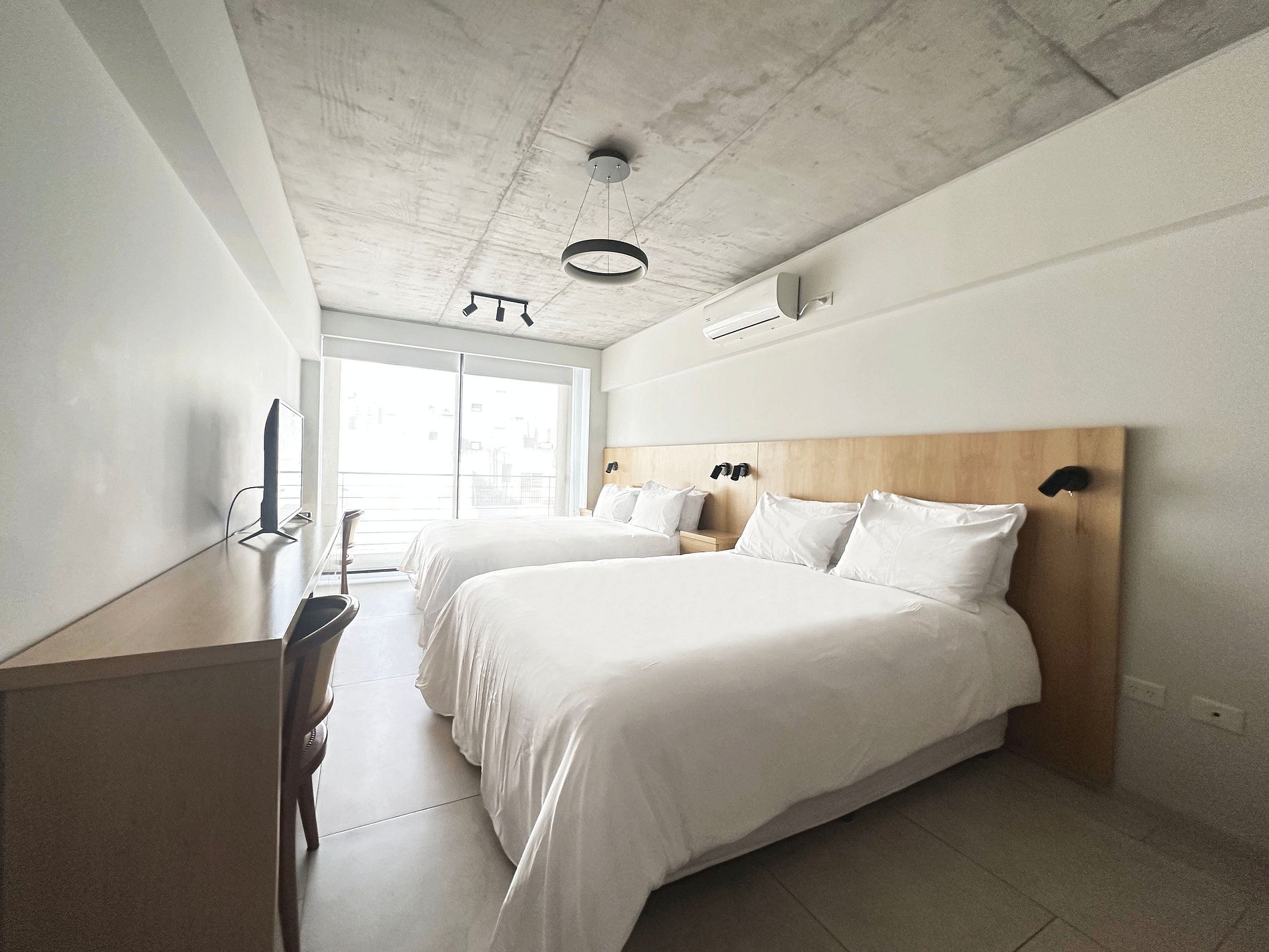 Este espacio combina diseño contemporáneo con funcionalidad, ofreciendo un ambiente luminoso y acogedor. Cuenta con un área equipada con dos camas matrimoniales y un gran escritorio. La cocina integrada está equipada, incluyendo heladera, horno eléctrico, microondas y vajilla completa.
