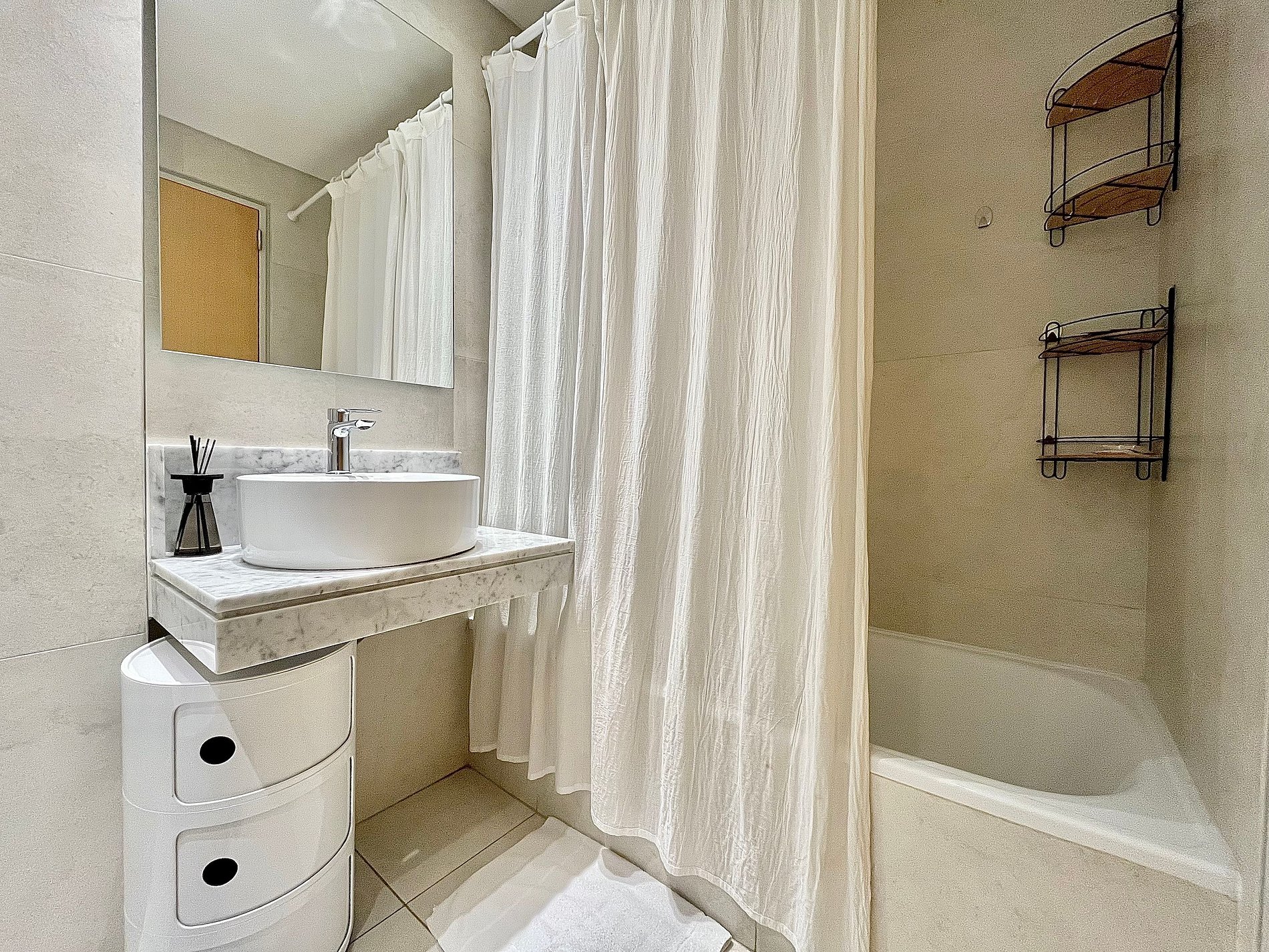 Cuenta con un área principal equipada con una cama matrimonial y una zona de estar con sofá y mesa de comedor. La cocina integrada está equipada, incluyendo heladera, horno eléctrico, microondas y vajilla completa. El baño es cómodo y moderno, cuenta con ducha tipo lluvia y bañera. Dispone de aire acondicionado frío/calor, conexión Wi-Fi y Smart TV.
